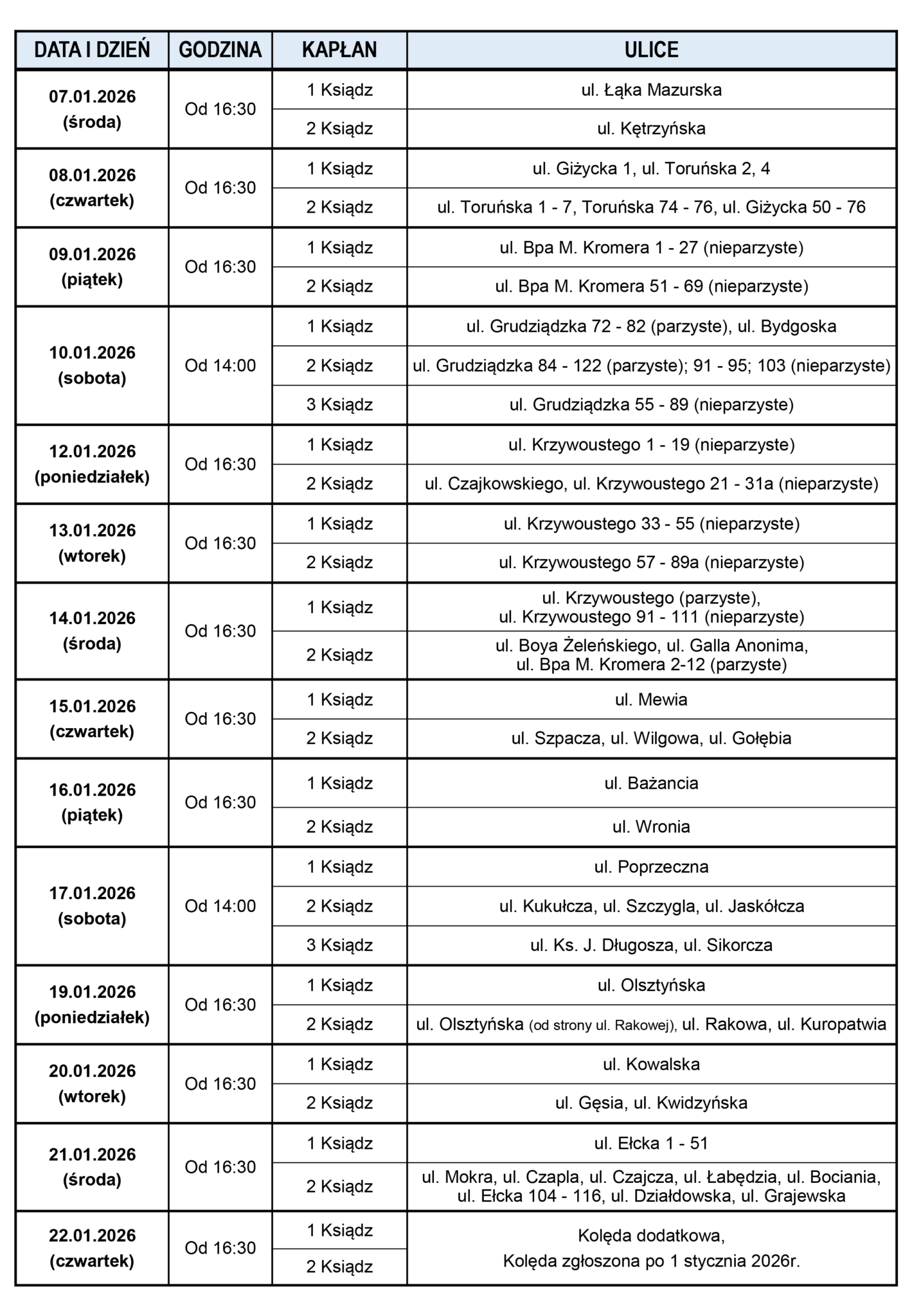 Jeżeli będą jeszcze składane zaproszenia od Parafian w zakrystii, to mogą być one realizowane 22 stycznia (czwartek) w ramach kolędy dodatkowej.